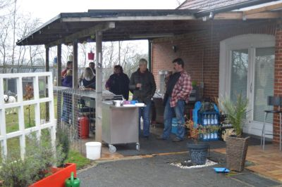 Bei schönem Wetter und reichlich Platz auf dem Grundstück, wurde nach einer entspannten Gassirunde bei reichlich Kaffee und kalten Getränken der Grill angeworfen. Für den Notfall, dass das Wetter nicht mitspielen würde, hatten Uwe, Susanne, Nicole und Michael ein gefühltes Mannschaftszelt aufgebaut.